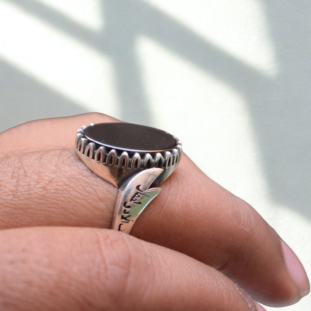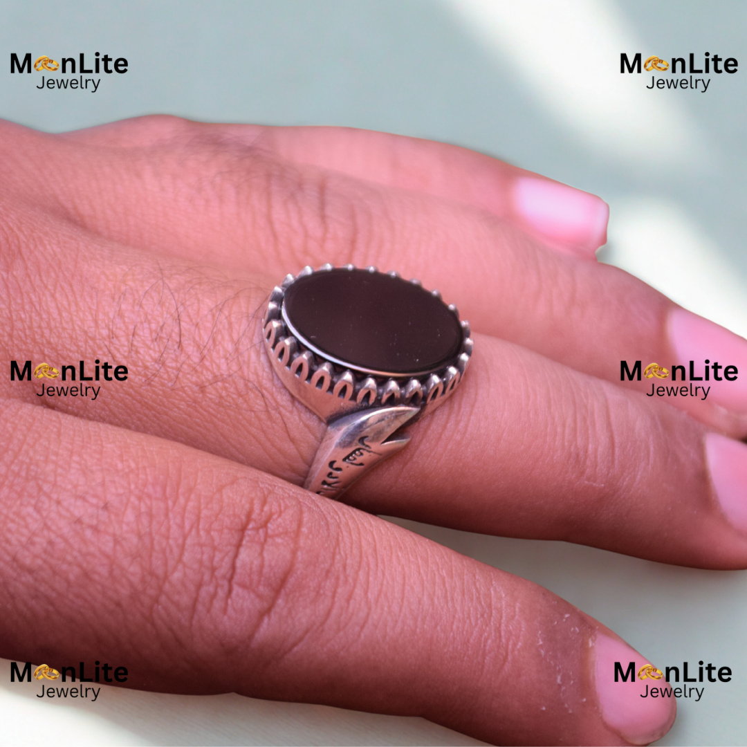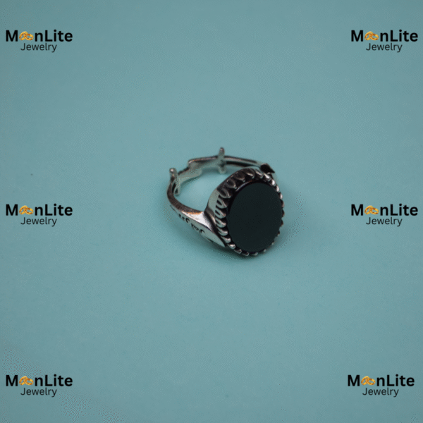 This men’s ring features a sleek, polished round black stone, giving it a bold and mysterious look. Its clean, minimal shape makes it perfect for men who appreciate timeless elegance with a modern twist.