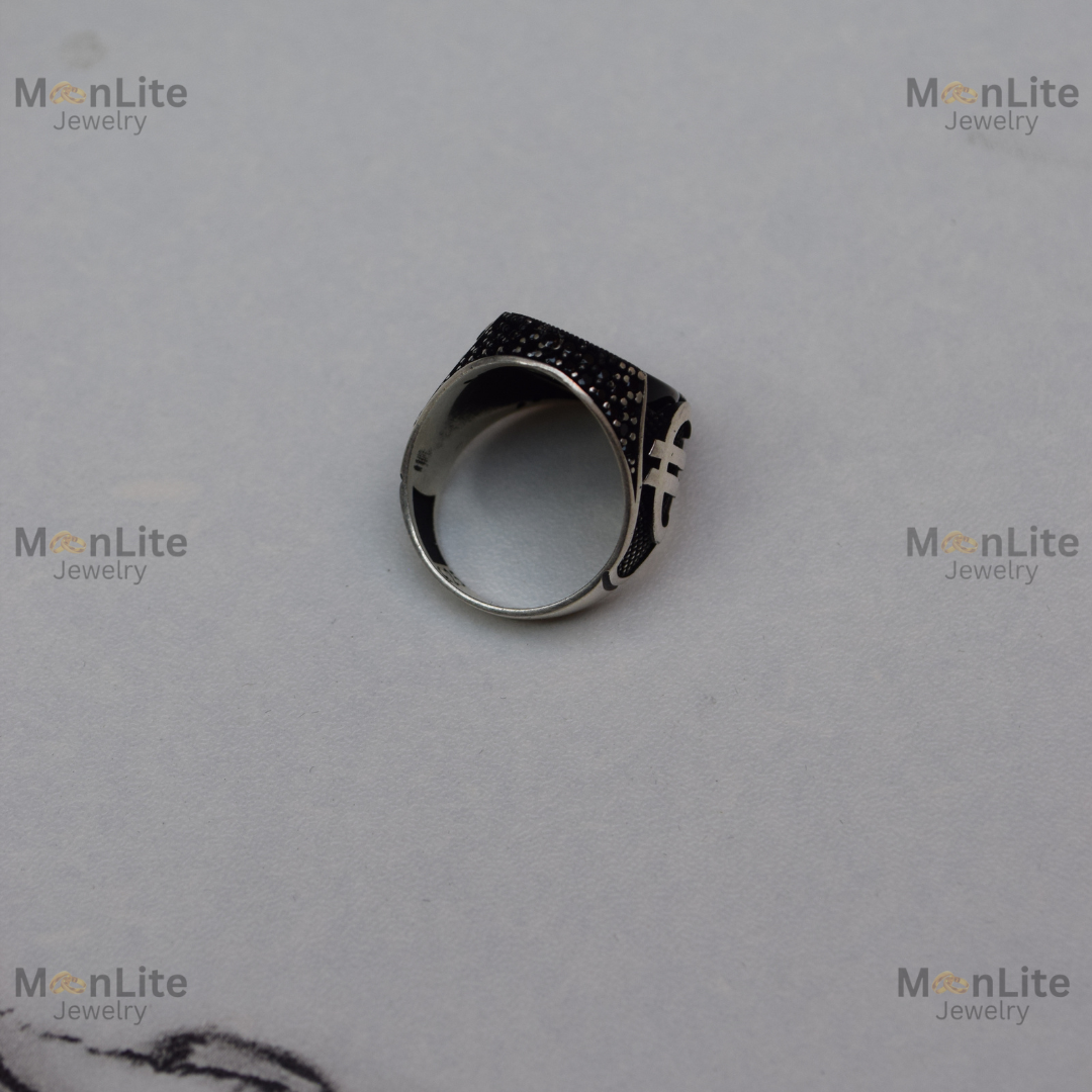 This men’s ring features a strong black shield-style face paired with a bold metallic emblem—crafted to deliver a powerful, masculine presence. Ideal for men who want jewelry that stands out without being flashy.