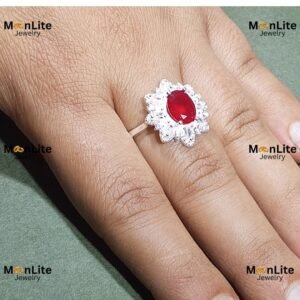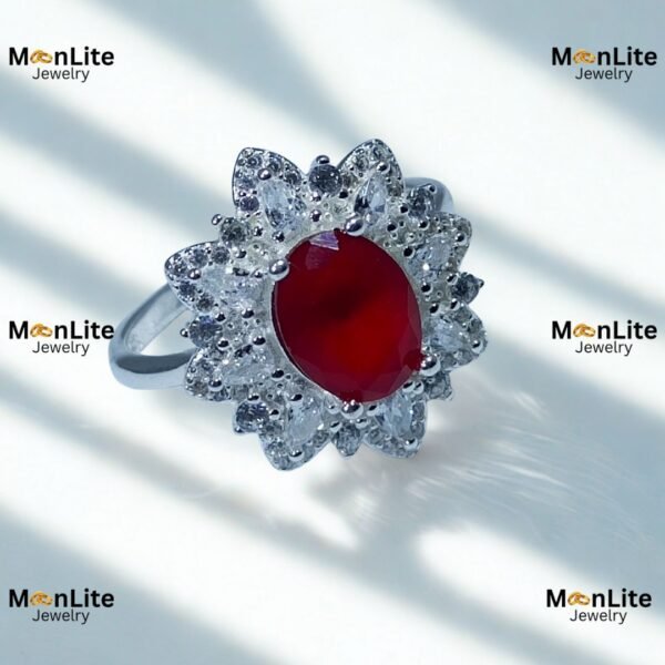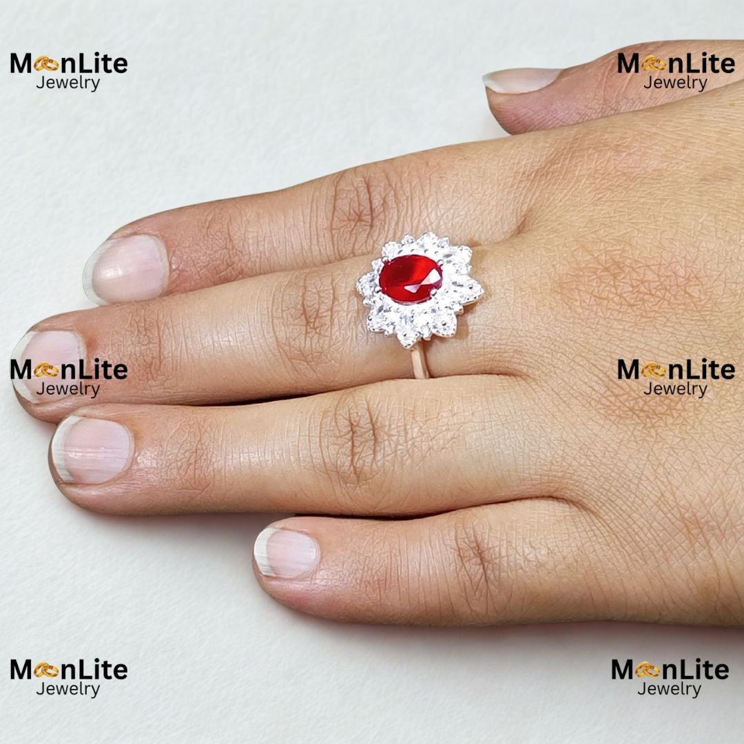Elevate your style with this beautifully crafted Ruby Red Stone Silver Ring, designed to bring luxury and charm to your jewelry collection. The centerpiece features a vibrant, deep red stone that captures attention instantly, symbolizing love, passion, and confidence. Surrounding the central stone is a stunning halo of sparkling white crystals, adding brilliance and enhancing the overall shine of the ring.