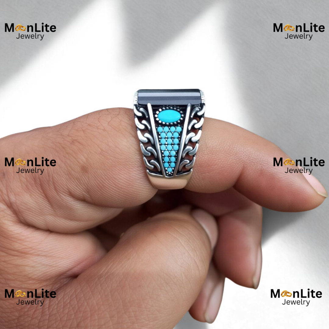 The ring features a blue turquoise-style stone that gives it a bold and stylish look.